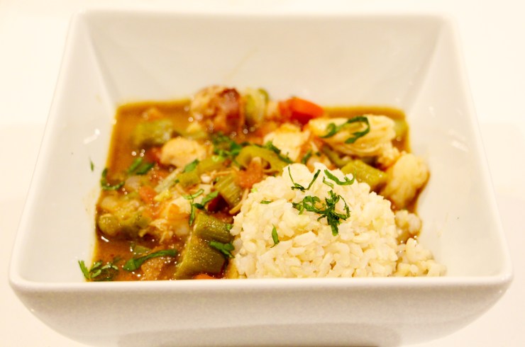 Begin to add the chicken broth a few ounces at a time, stirring continuously. Stop adding liquid once you’re satisfied with the level of thickness of the soup. Once the desired amount of broth has been added to the pot, add the cut sausage and shredded (or cubed) chicken. Add salt to taste then turn up the heat and bring to a boil. Once the pot has reached boiling temperature, add the okra. Stir well, turn the temperature to a simmer and allow to simmer (covered) for thirty minutes. After thirty minutes, add the shrimp, mix well and cook for three minutes more.